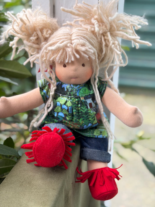Our Cuddle Dolls are a smaller version of our Sitting Dolls. Their design makes them perfect for children who love to carry their doll everywhere — huggable, posable, and endlessly lovable. These are great 'first dolls' as their hair is a bit simpler with no hand spun art yarn in it and simple clothing for dressing and playing.