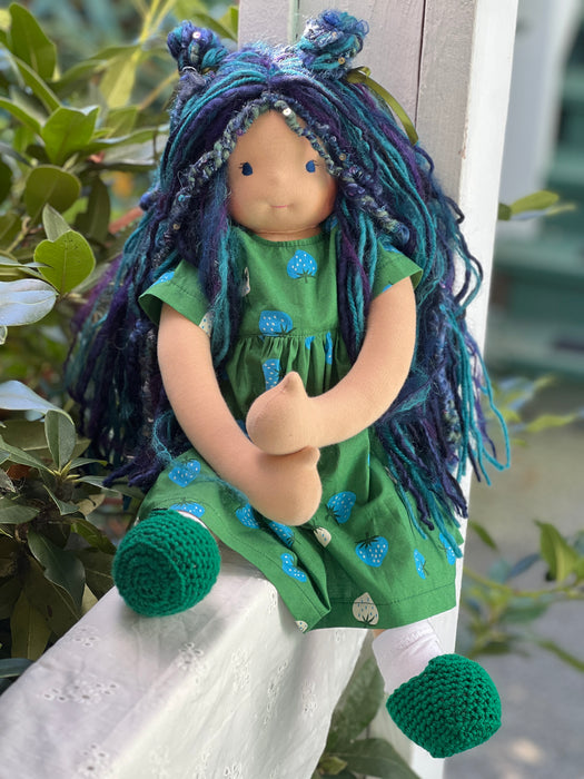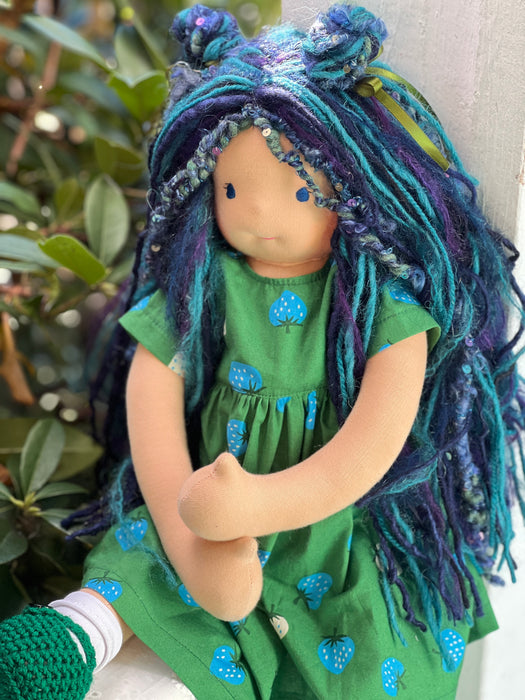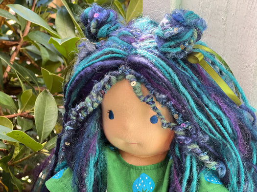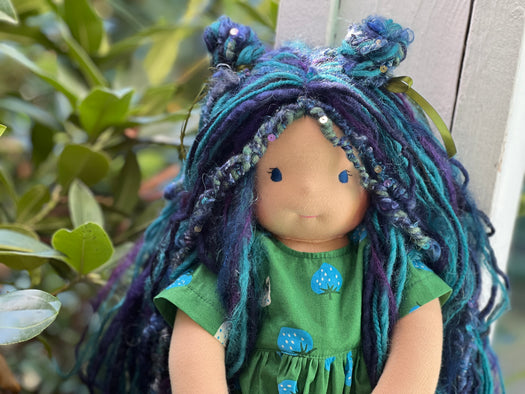 Meet Sapphire, one of our cherished heirloom dolls, handmade with love and intention. Her sunkissed cotton skin comes from specialty tricot sourced in the Netherlands, her eyes are delicately hand embroidered, and her hair is created from wool and mohair yarns many of them hand dyed, spun and hand stitched strand by strand. She’s stuffed with clean, carded Canadian wool, giving her a natural, comforting weight that children adore.