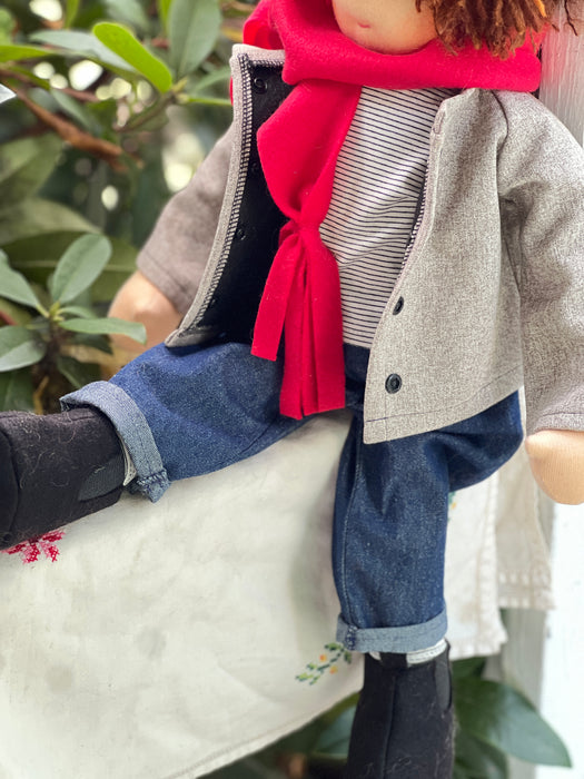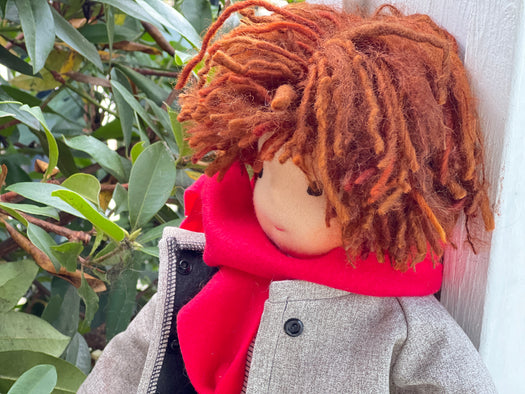 Meet Duke, one of our cherished heirloom dolls, handmade with love and intention. His sunkissed cotton skin comes from specialty tricot sourced in the Netherlands, his eyes are delicately hand embroidered, and his hair is created from wool and mohair yarns many of them hand dyed, spun and hand stitched strand by strand. He’s stuffed with clean, carded Canadian wool, giving her a natural, comforting weight that children adore.