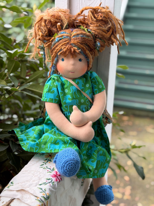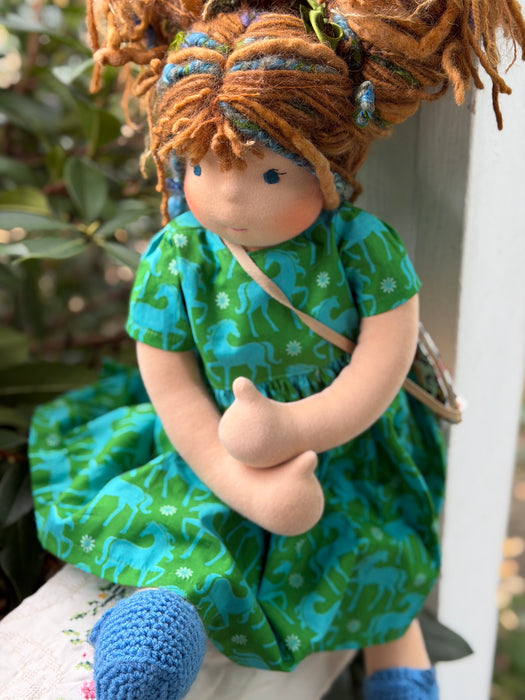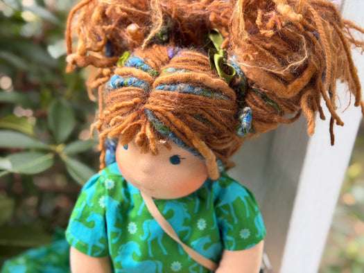 Meet Hailey, one of our cherished heirloom dolls, handmade with love and intention. Her sunkissed cotton skin comes from specialty tricot sourced in the Netherlands, her eyes are delicately hand embroidered, and her hair is created from wool and mohair yarns many of them hand dyed, spun and hand stitched strand by strand. She’s stuffed with clean, carded Canadian wool, giving her a natural, comforting weight that children adore.