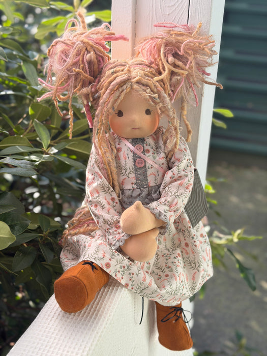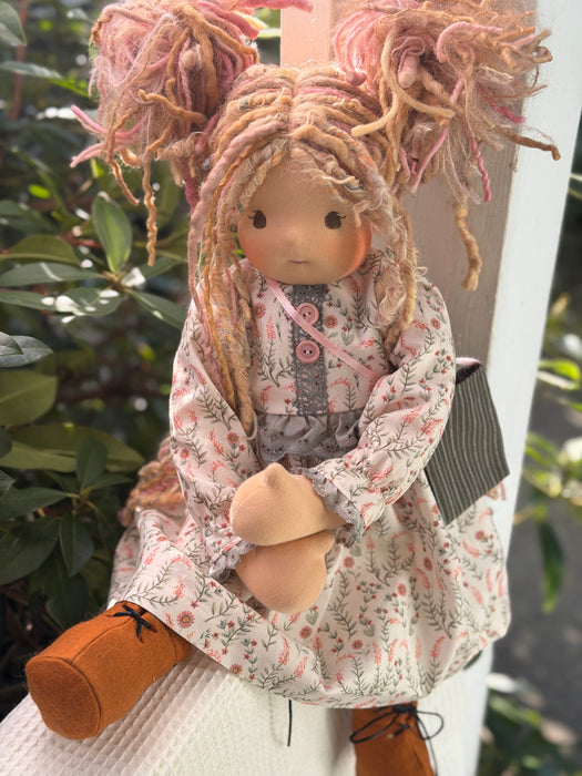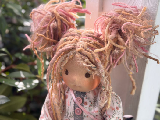 Meet Amelia, one of our cherished heirloom dolls, handmade with love and intention. Her sunkissed cotton skin comes from specialty tricot sourced in the Netherlands, her eyes are delicately hand embroidered, and her hair is created from wool and mohair yarns many of them hand dyed, spun and hand stitched strand by strand. She’s stuffed with clean, carded Canadian wool, giving her a natural, comforting weight that children adore.