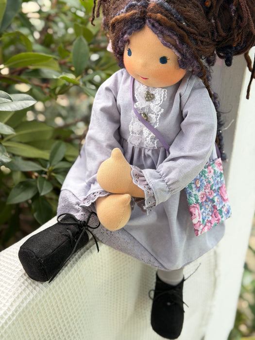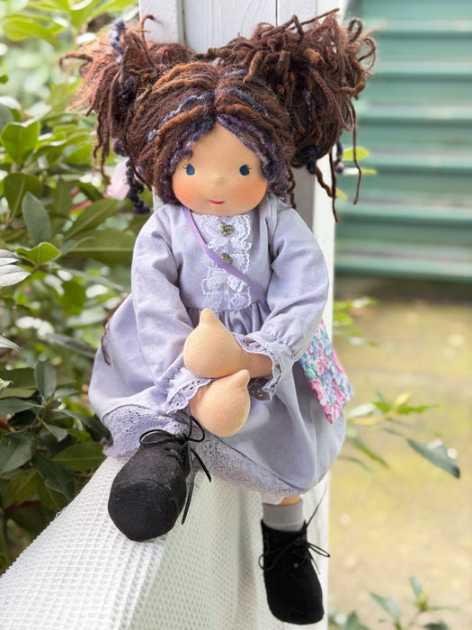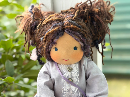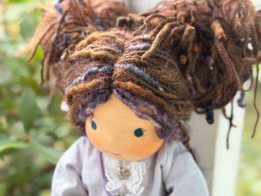 Meet Bridget, one of our cherished heirloom dolls, handmade with love and intention. Her sunkissed cotton skin comes from specialty tricot sourced in the Netherlands, her eyes are delicately hand embroidered, and her hair is created from wool and mohair yarns many of them hand dyed, spun and hand stitched strand by strand. She's stuffed with clean, carded Canadian wool, giving her a natural, comforting weight that children adore.