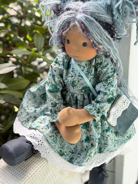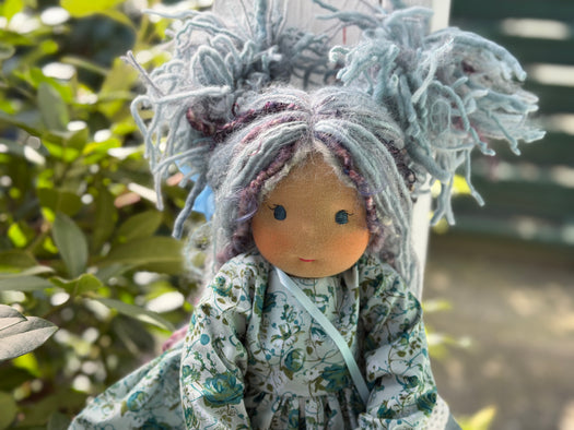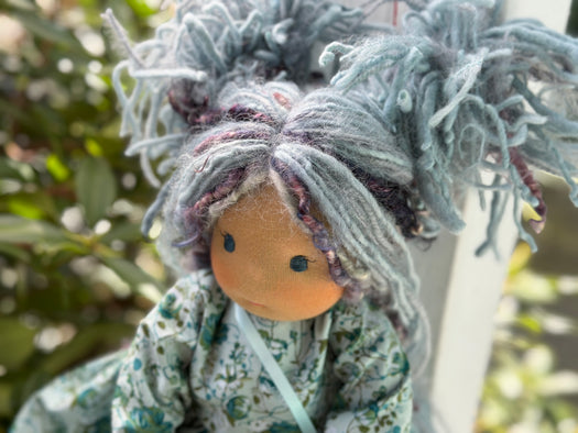 Meet Thalia, one of our cherished heirloom dolls, handmade with love and intention. Her mocha cotton skin comes from specialty tricot sourced in the Netherlands, her eyes are delicately hand embroidered, and her hair is created from wool and mohair yarns many of them hand dyed, spun and hand stitched strand by strand. She’s stuffed with clean, carded Canadian wool, giving her a natural, comforting weight that children adore.