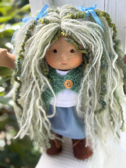 Meet  one of our sweetest heirloom dolls, perfect for little ones who love little things. With sunkissed cotton skin and soft hand-embroidered eyes, she comes dressed in the pictured outfit, ready for hugs and play.