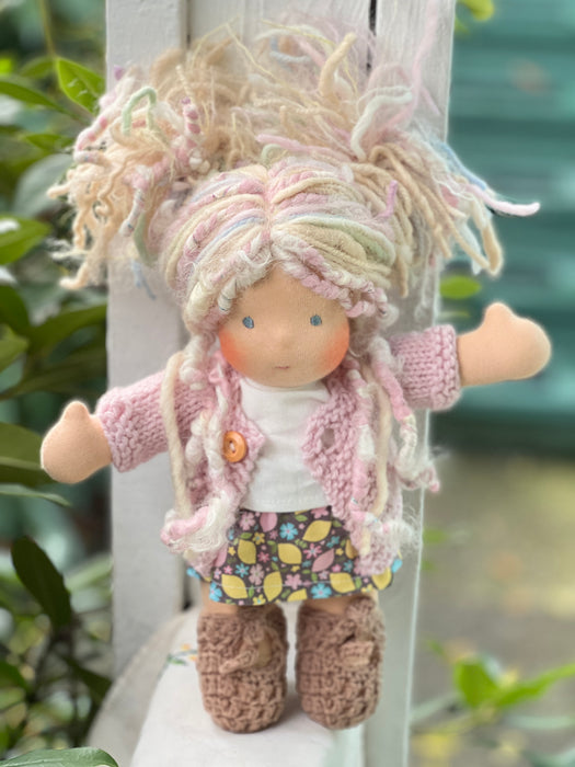 Meet  one of our sweetest heirloom dolls, perfect for little ones who love little things. With sunkissed cotton skin and soft hand-embroidered eyes, she comes dressed in the pictured outfit, ready for hugs and play.