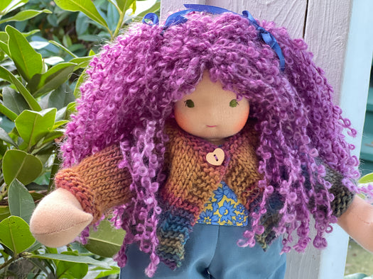 Made with natural fibres, each Little Friend has  hand-dyed hair yarn, a cotton knit “skin,” and is stuffed with West Coast wool for that comforting, natural weight children love. We’re happy to personalize your doll with freckles, a messy buns, or even a name change, just let us know!