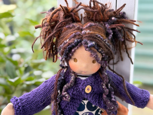 Made with natural fibres, each Little Friend has  hand-dyed hair yarn, a cotton knit “skin,” and is stuffed with West Coast wool for that comforting, natural weight children love. We’re happy to personalize your doll with freckles, a messy buns, or even a name change, just let us know!