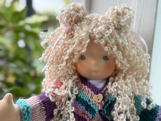 Made with natural fibres, each Little Friend has  hand-dyed hair yarn, a cotton knit “skin,” and is stuffed with West Coast wool for that comforting, natural weight children love. We’re happy to personalize your doll with freckles, a messy buns, or even a name change, just let us know!
