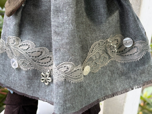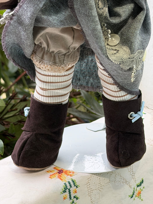 Each Ashton Doll is dressed in a one-of-a-kind outfit made with natural fibres and vintage trims, designed by our beloved team member Sam, who also created this doll’s unique body pattern. This collection is a passion project from both of us — a celebration of craftsmanship, artistry, and heart.