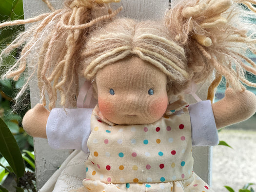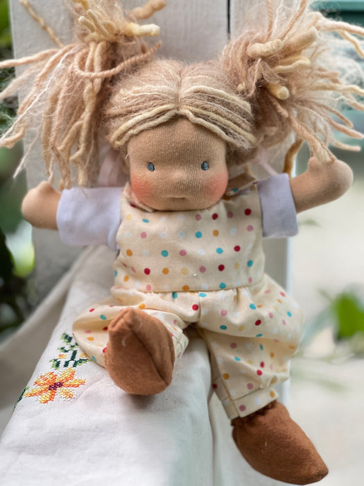 What is this little bundle of sweetness? A Piccolina! Our smallest heirloom doll, measuring about 9" of pure cuteness. Though tiny, Piccolinas are made with the same natural materials and love as our larger dolls — cotton knit, Canadian wool, and all the heart our team can stitch in.