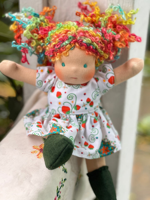What is this little bundle of sweetness? A Piccolina! Our smallest heirloom doll, measuring about 9" of pure cuteness. Though tiny, Piccolinas are made with the same natural materials and love as our larger dolls — cotton knit, Canadian wool, and all the heart our team can stitch in.