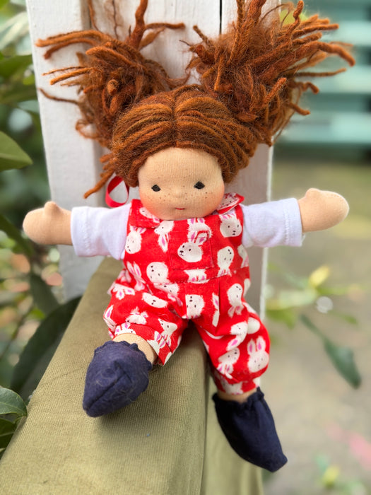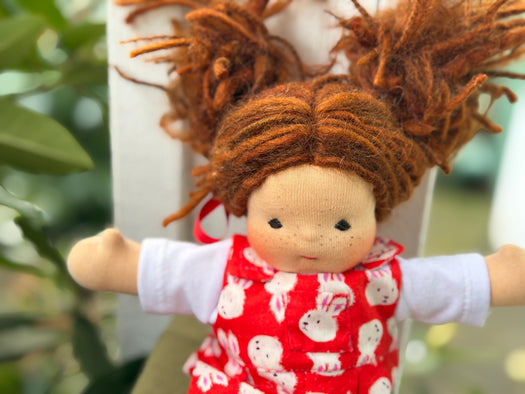 What is this little bundle of sweetness? A Piccolina! Our smallest heirloom doll, measuring about 9" of pure cuteness. Though tiny, Piccolinas are made with the same natural materials and love as our larger dolls — cotton knit, Canadian wool, and all the heart our team can stitch in.