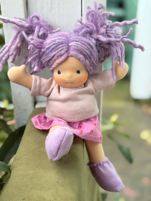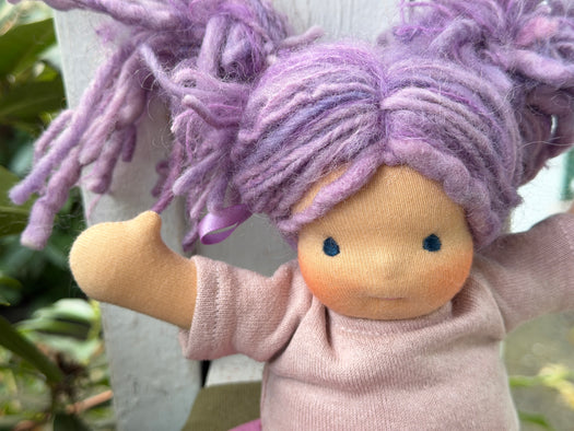 What is this little bundle of sweetness? A Piccolina! Our smallest heirloom doll, measuring about 9" of pure cuteness. Though tiny, Piccolinas are made with the same natural materials and love as our larger dolls — cotton knit, Canadian wool, and all the heart our team can stitch in.
