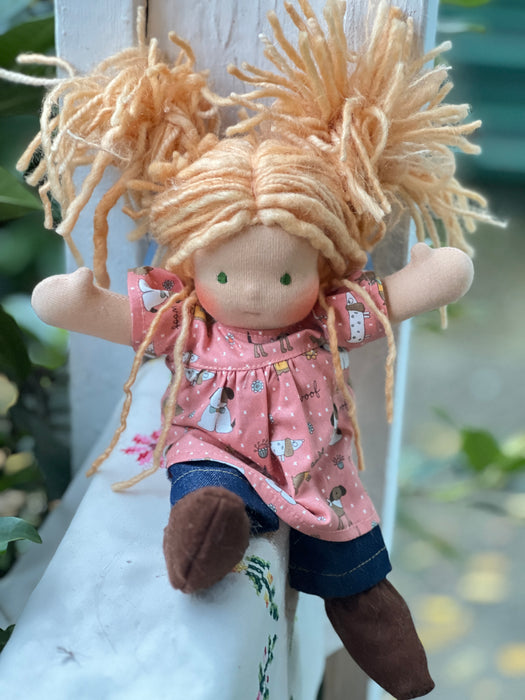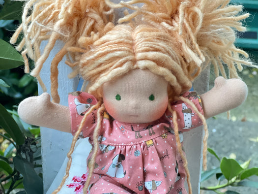 What is this, you may ask? Well - this is a Piccolina! Our smallest doll measuring in at 9" of cuteness. These dolls are made of the same amazing ingredients as our other dolls - wool ,cotton and a whole lotta love and care. These dolls have a similar body to our cuddle dolls with bendy limbs that can sit. They are just so wee and cute - I love them.