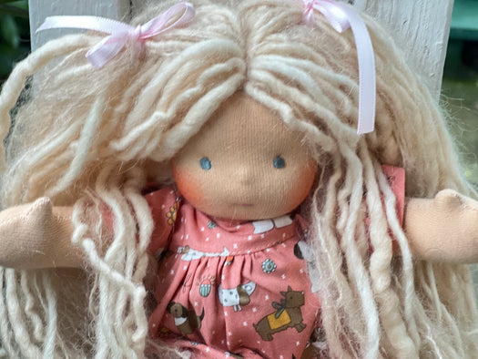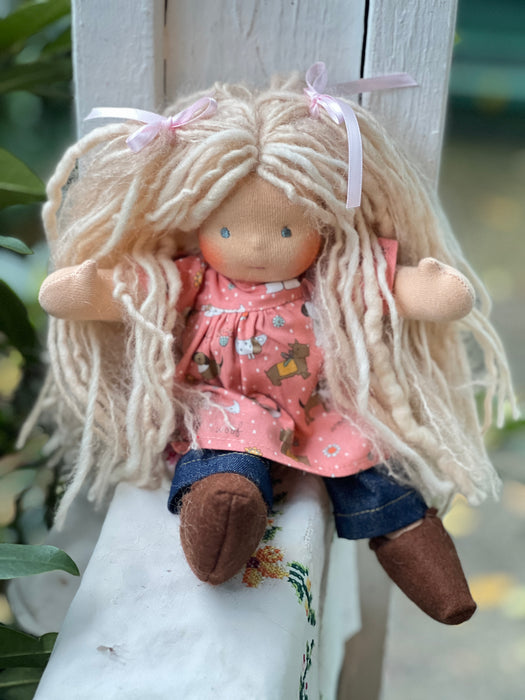 What is this, you may ask? Well - this is a Piccolina! Our smallest doll measuring in at 9" of cuteness. These dolls are made of the same amazing ingredients as our other dolls - wool ,cotton and a whole lotta love and care. These dolls have a similar body to our cuddle dolls with bendy limbs that can sit. They are just so wee and cute - I love them.