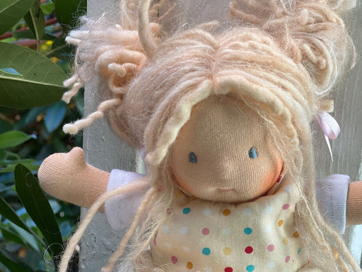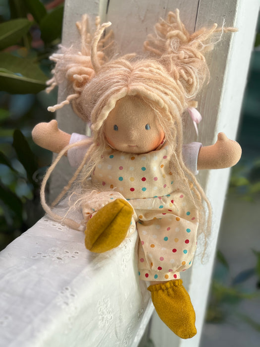 What is this little bundle of sweetness? A Piccolina! Our smallest heirloom doll, measuring about 9" of pure cuteness. Though tiny, Piccolinas are made with the same natural materials and love as our larger dolls — cotton knit, Canadian wool, and all the heart our team can stitch in.