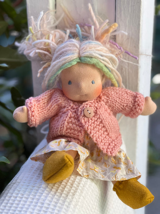 What is this little bundle of sweetness? A Piccolina! Our smallest heirloom doll, measuring about 9" of pure cuteness. Though tiny, Piccolinas are made with the same natural materials and love as our larger dolls — cotton knit, Canadian wool, and all the heart our team can stitch in.