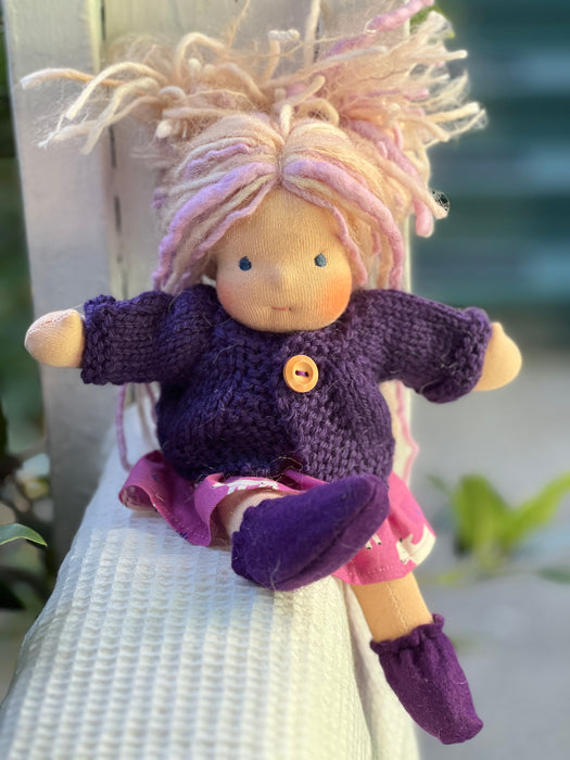 What is this little bundle of sweetness? A Piccolina! Our smallest heirloom doll, measuring about 9" of pure cuteness. Though tiny, Piccolinas are made with the same natural materials and love as our larger dolls — cotton knit, Canadian wool, and all the heart our team can stitch in.