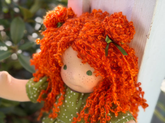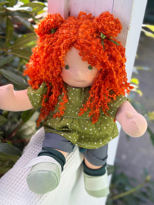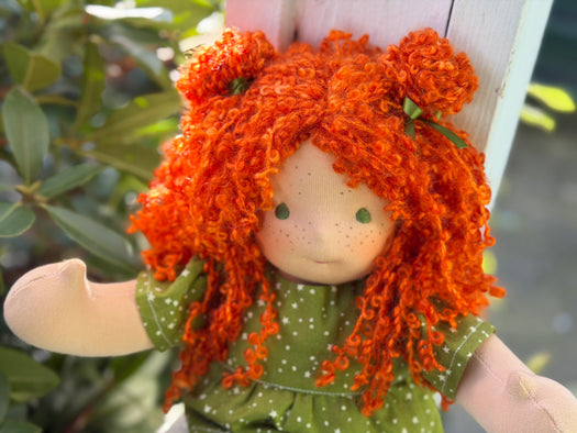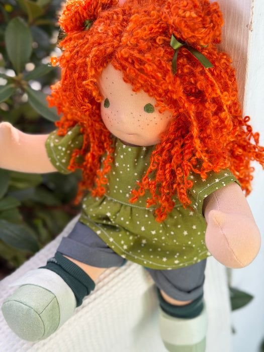 Meet Molly, one of our treasured heirloom Sitting Dolls. She has sunkissed cotton skin, soft embroidered eyes, and beautiful wool/mohair yarn hair. Dressed in her pictured outfit, underpants, and wool felt shoes, she’s ready for endless adventures.