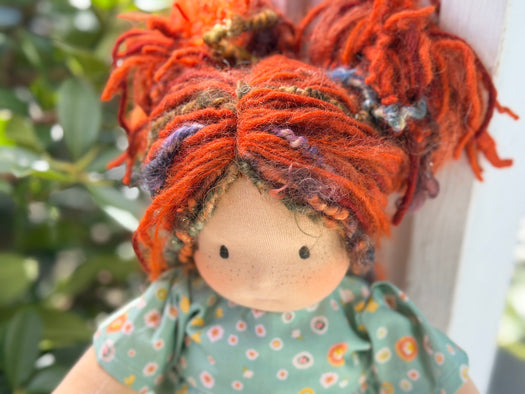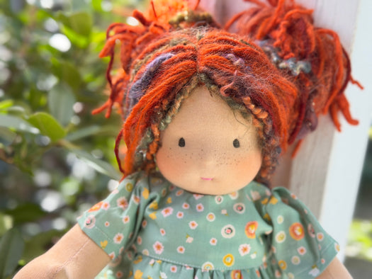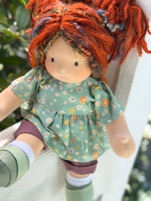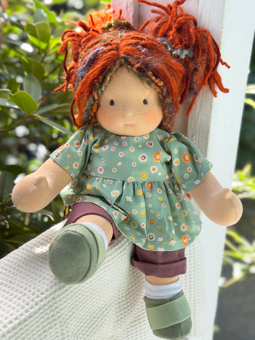 Meet Georgina, one of our treasured heirloom Sitting Dolls. She has sunkissed cotton skin, soft embroidered eyes, and beautiful wool/mohair yarn hair. Dressed in her pictured outfit, underpants, and wool felt shoes, she’s ready for endless adventures.