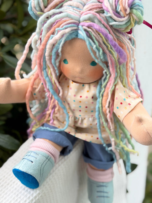Meet Vivian, one of our treasured heirloom Sitting Dolls. She has sunkissed cotton skin, soft embroidered eyes, and beautiful wool/mohair yarn hair. Dressed in her pictured outfit, underpants, and wool felt shoes, she’s ready for endless adventures.