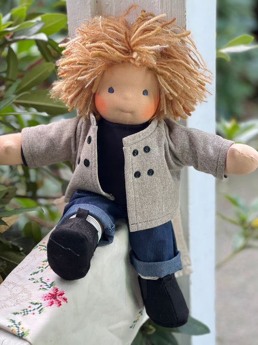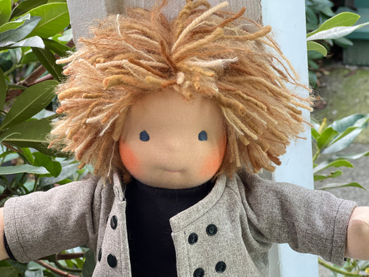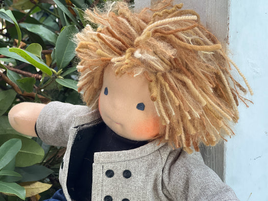 Meet Jude, one of our treasured heirloom Sitting Dolls. He has sunkissed cotton skin, soft embroidered eyes, and beautiful wool/mohair yarn hair. Dressed in his pictured outfit, underpants, and wool felt shoes, he’s ready for endless adventures.