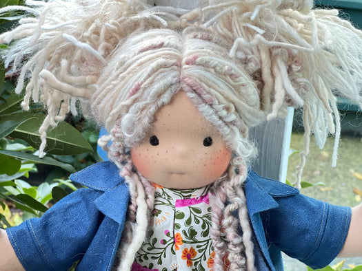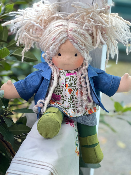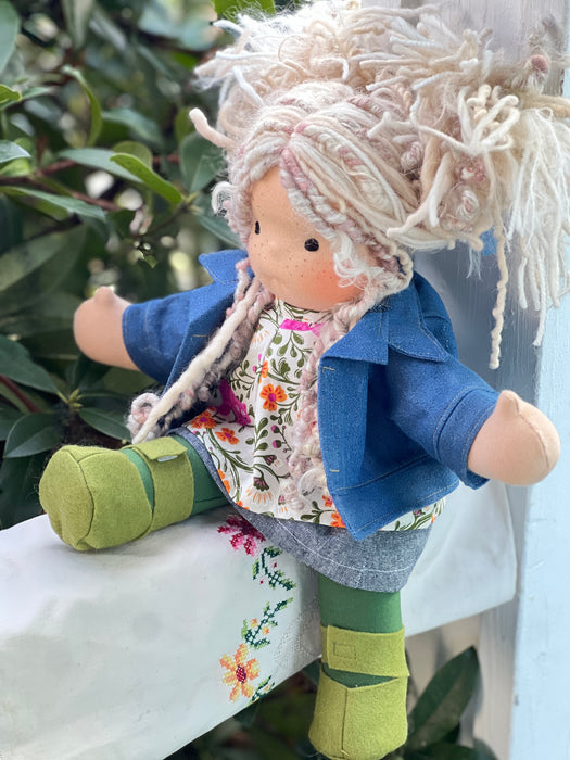 Meet Raleigh, one of our treasured heirloom Sitting Dolls. She has sunkissed cotton skin, soft embroidered eyes, and beautiful wool/mohair yarn hair. Dressed in her pictured outfit, underpants, and wool felt shoes, she’s ready for endless adventures.