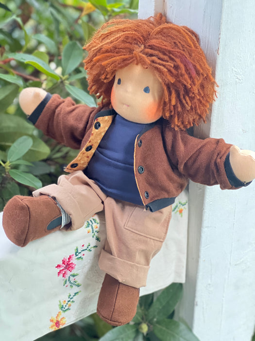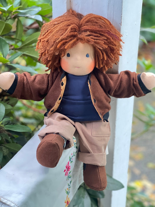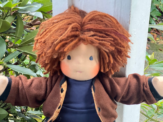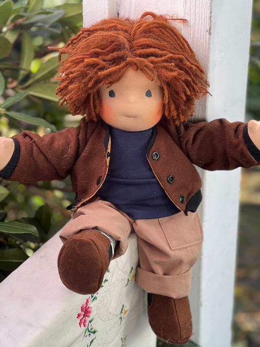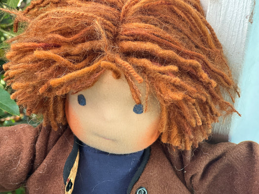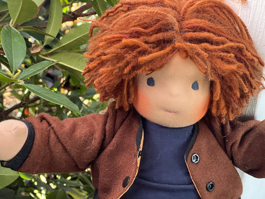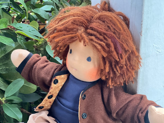 Meet Grey , one of our treasured heirloom Sitting Dolls. She has sunkissed cotton skin, soft embroidered eyes, and beautiful wool/mohair yarn hair. Dressed in her pictured outfit, underpants, and wool felt shoes, she’s ready for endless adventures.