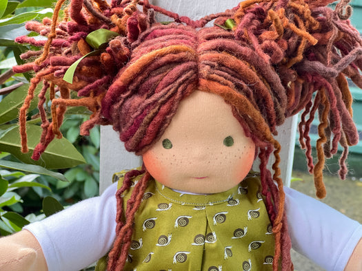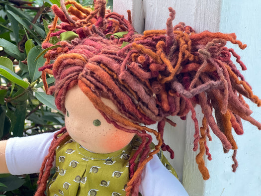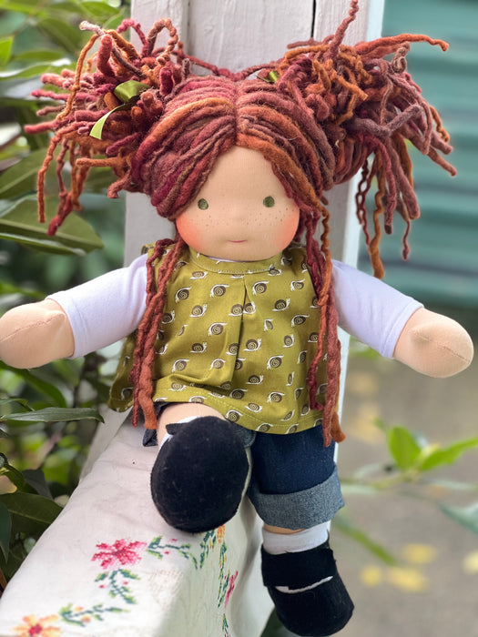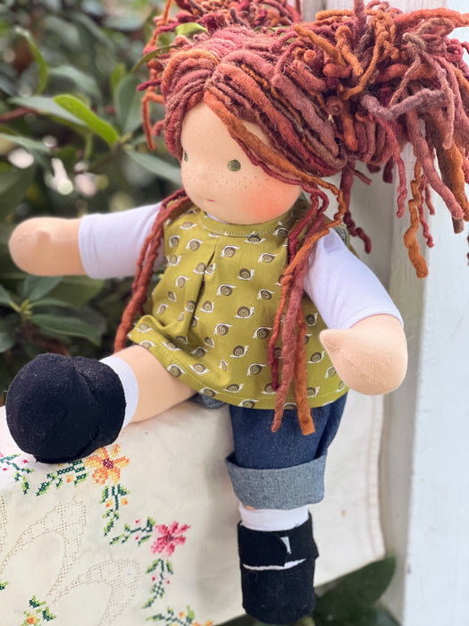 Meet Maple, one of our treasured heirloom Sitting Dolls. She has sunkissed cotton skin, soft embroidered eyes, and beautiful wool/mohair yarn hair. Dressed in her pictured outfit, underpants, and wool felt shoes, she’s ready for endless adventures.