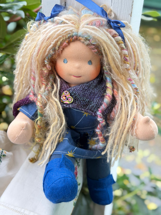 Meet Marianne, one of our treasured heirloom Sitting Dolls. She has sunkissed cotton skin, soft embroidered eyes, and beautiful wool/mohair yarn hair. Dressed in her pictured outfit, underpants, and wool felt shoes, she’s ready for endless adventures.