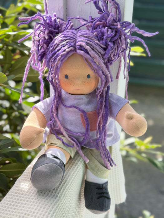 Meet Asha, one of our treasured heirloom Sitting Dolls. She has sunkissed cotton skin, soft embroidered eyes, and beautiful wool/mohair yarn hair. Dressed in her pictured outfit, underpants, and wool felt shoes, she’s ready for endless adventures.