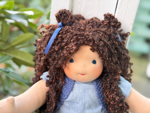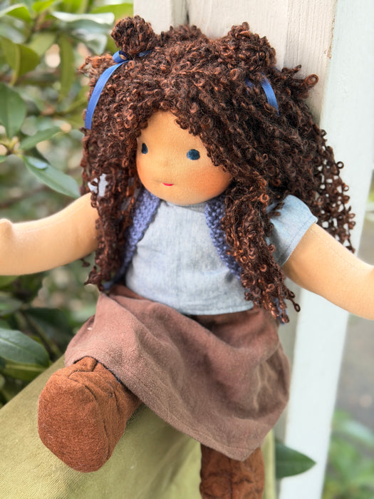 Meet Maple, one of our treasured heirloom Sitting Dolls. She has sunkissed cotton skin, soft embroidered eyes, and beautiful wool/mohair yarn hair. Dressed in her pictured outfit, underpants, and wool felt shoes, she’s ready for endless adventures.
