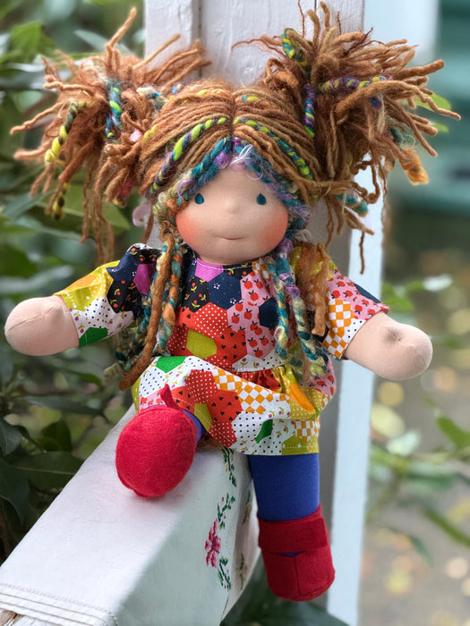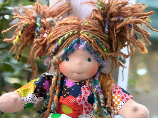 Meet Chantilly, one of our treasured heirloom Sitting Dolls. She has sunkissed cotton skin, soft embroidered eyes, and beautiful wool/mohair yarn hair. Dressed in her pictured outfit, underpants, and wool felt shoes, she’s ready for endless adventures.