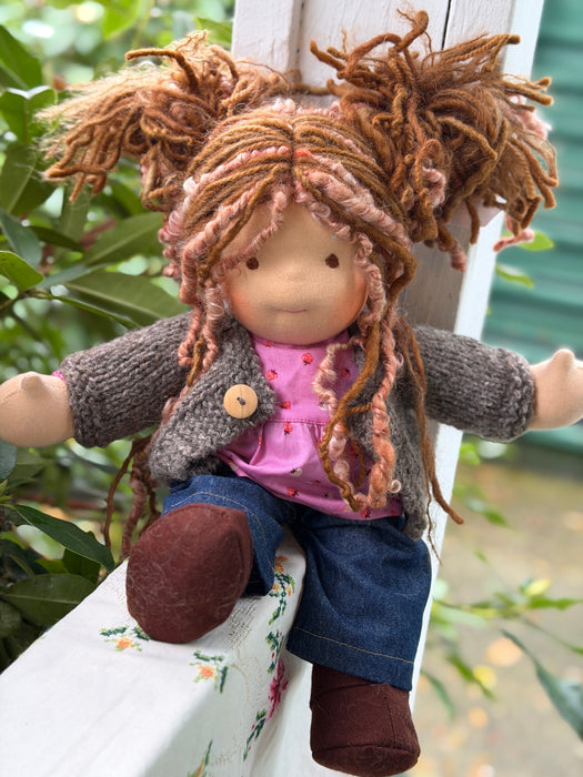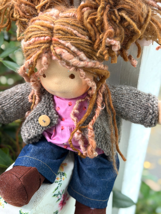 Meet Rosie, one of our treasured heirloom Sitting Dolls. She has sunkissed cotton skin, soft embroidered eyes, and beautiful wool/mohair yarn hair. Dressed in her pictured outfit, underpants, and wool felt shoes, she’s ready for endless adventures.