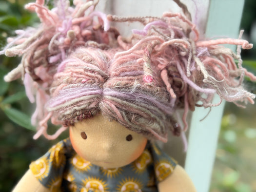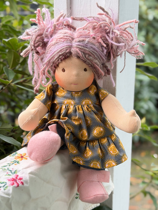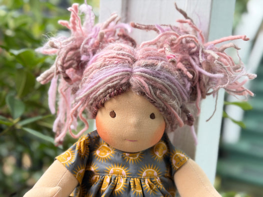 Meet Pixie, one of our treasured heirloom Sitting Dolls. She has sunkissed cotton skin, soft embroidered eyes, and beautiful wool/mohair yarn hair. Dressed in her pictured outfit, underpants, and wool felt shoes, she’s ready for endless adventures.