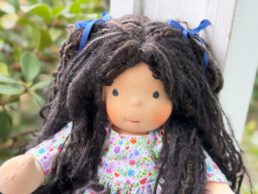 Meet Olivia, one of our treasured heirloom Sitting Dolls. She has sunkissed cotton skin, soft embroidered eyes, and beautiful wool/mohair yarn hair. Dressed in her pictured outfit, underpants, and wool felt shoes, she’s ready for endless adventures.